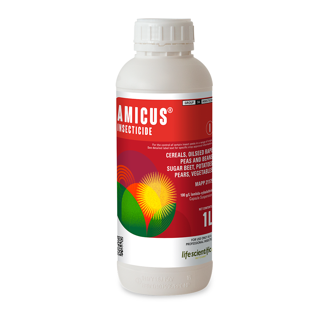 AMICUS is a contact and ingested pyrethroid insecticide for control of a wide range of pests in wheat, barley, oats, oilseed rape, combining, vining and edible-podded peas, field beans, potatoes, sugar beet, carrots, parsnip, Brussels sprouts, cabbage, cauliflower, broccoli, calabrese and pear crops.