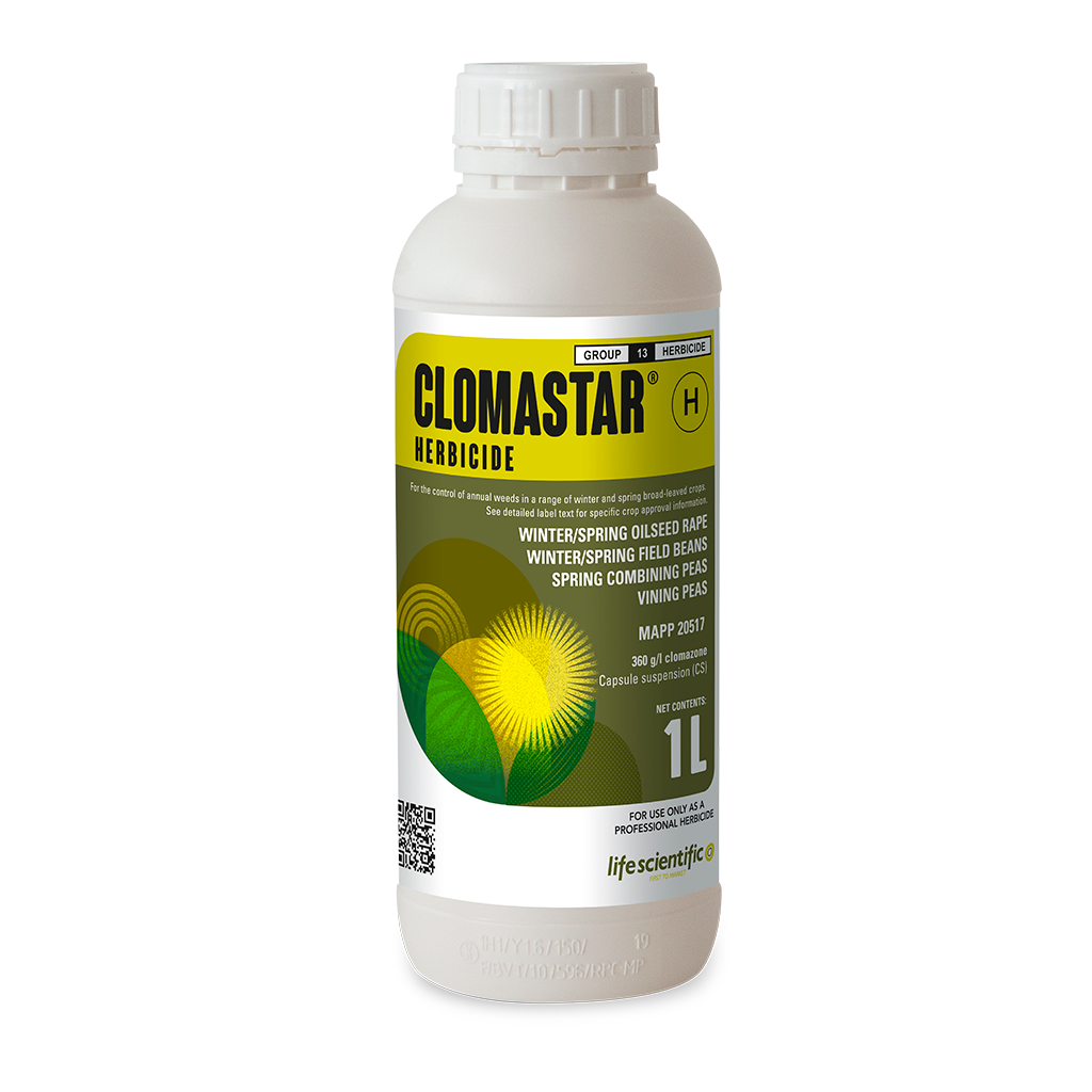 CLOMASTAR is a residual herbicide containing 360 g/l clomazone formulated as a capsule suspension (CS). It is designed for the control of annual weeds in a range of winter and spring broad-leaved crops, including oilseed rape, field beans, and peas. The product acts by inhibiting the biosynthesis of carotenoid pigments which are necessary for photosynthesis, causing susceptible weeds to emerge bleached and die shortly after.