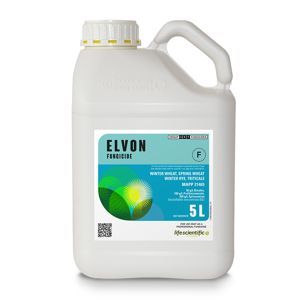 ELVON is a protective and systemic fungicide formulated as an emulsifiable concentrate (EC) for use in winter wheat, spring wheat, winter rye, and triticale. It contains 50 g/L Bixafen, 100 g/L Prothioconazole, and 250 g/L Spiroxamine, combining active substances from FRAC Groups 3, 5, and 7 (SDHI, DMI, and SBI) for effective resistance management. This product controls a broad spectrum of diseases including Septoria leaf blotch, Yellow rust, Brown rust, and Powdery mildew. It is designed for professional use with a maximum individual dose of 1.5 L/ha.