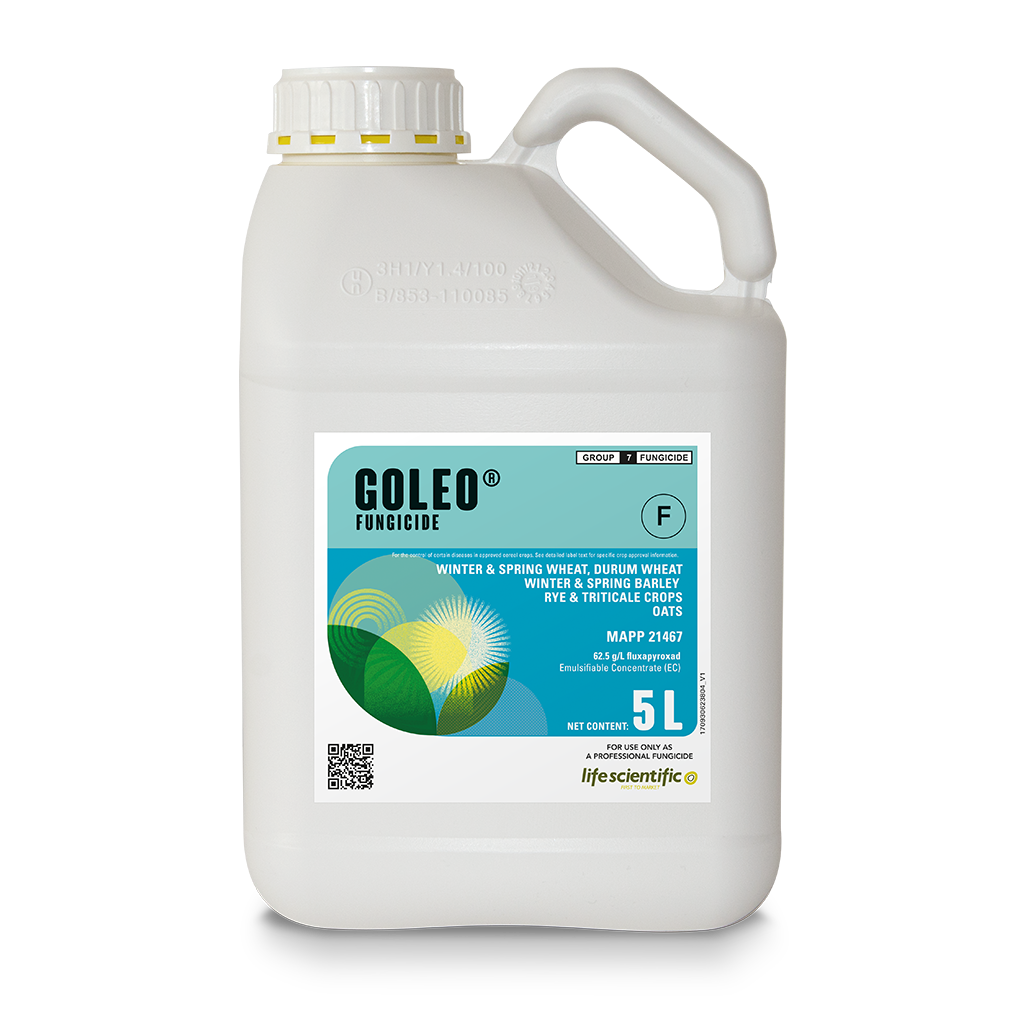 GOLEO is a selective protective and systemic fungicide containing 62.5 g/L fluxapyroxad, formulated as an Emulsifiable Concentrate (EC). It functions as an SDHI fungicide (FRAC Group 7) for the control of diseases such as Septoria leaf blotch, Brown rust, Yellow rust, and Powdery mildew. This product is approved for use on winter and spring wheat, durum wheat, winter and spring barley, rye, triticale, and oat crops.