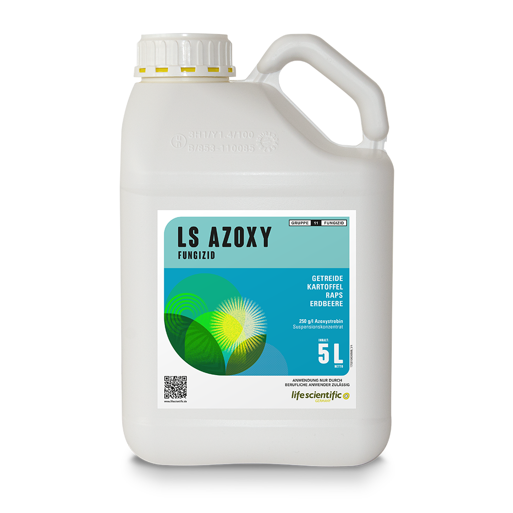 LS AZOXY is a protectively acting fungicide formulated as a suspension concentrate (SC) with 250 g/l Azoxystrobin. The product combats a broad spectrum of fungal diseases in cereals, potatoes, oilseed rape, legumes, and various vegetable crops. The active ingredient belongs to the strobilurin group (FRAC Group 11) and acts both systemically and translaminarly by inhibiting the cell respiration of harmful fungi. LS AZOXY offers a long-lasting effect and protects crops against new infection.