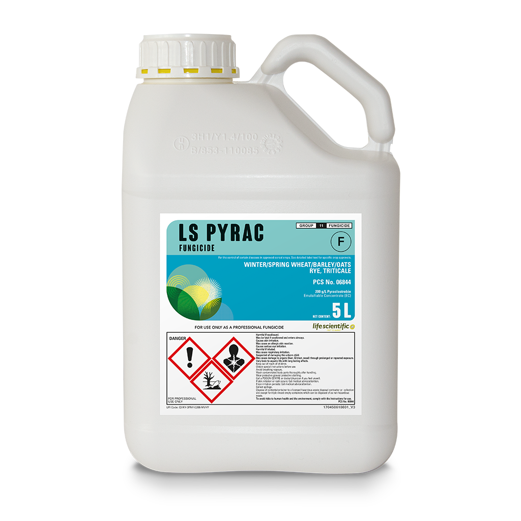 LS PYRAC is a selective systemic fungicide, absorbed by the foliage, with protectant, curative and translaminar properties. It may also cause delayed senescence, greener leaves and grain yield increases in the absence of visible disease symptoms. It is for selective use in winter wheat, winter barley, spring wheat, spring barley, winter oats and spring oats, rye and triticale.