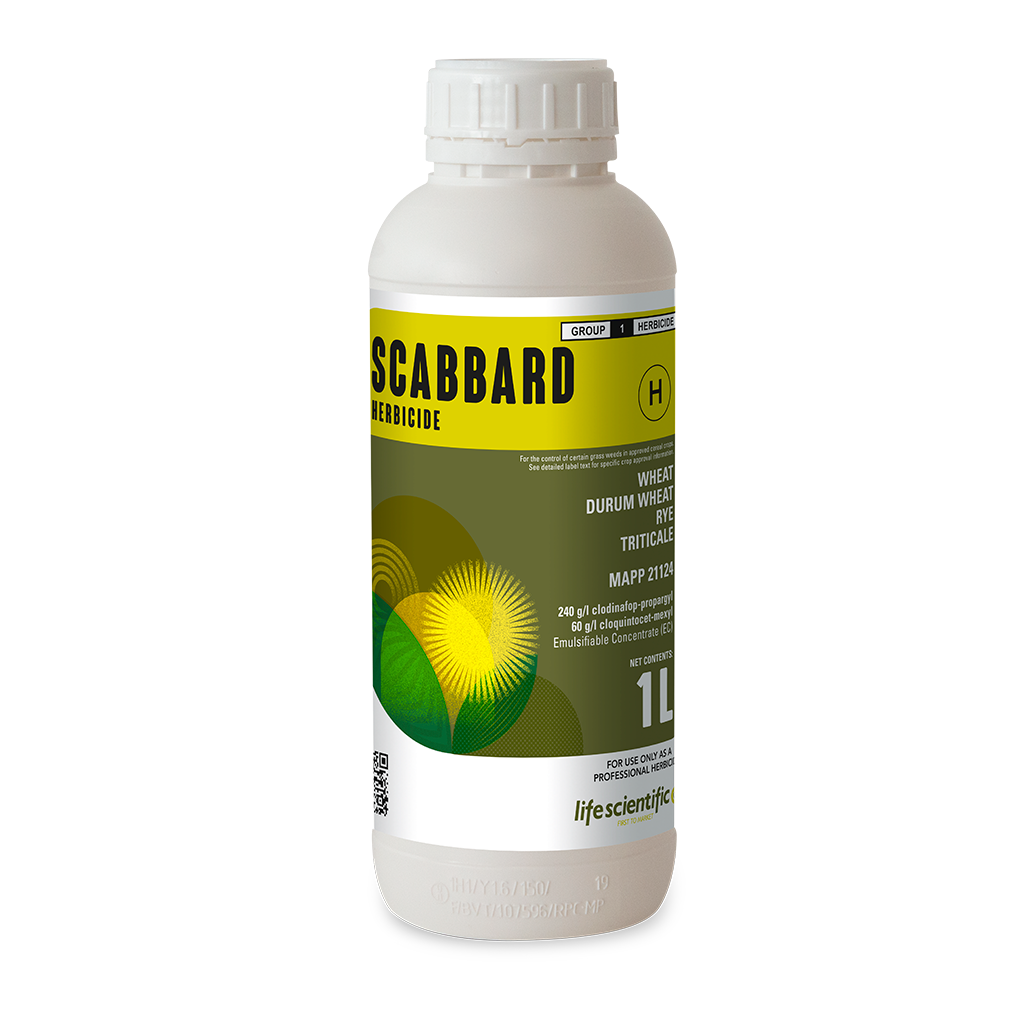 SCABBARD is a selective post-emergence herbicide for the control of Wild-oats, Rough meadow-grass and moderate control of Italian Rye-grass in wheat, durum wheat, rye, triticale, and autumn-sown spring wheat. SCABBARD may also be used for the control of Black-grass as part of a Black-grass management strategy. It has no residual activity and will only control weeds that have emerged at the time of application. Optimum activity is achieved under good growing conditions and control may be slower or reduced under cold or dry conditions. It has no activity against broad-leaved weeds.