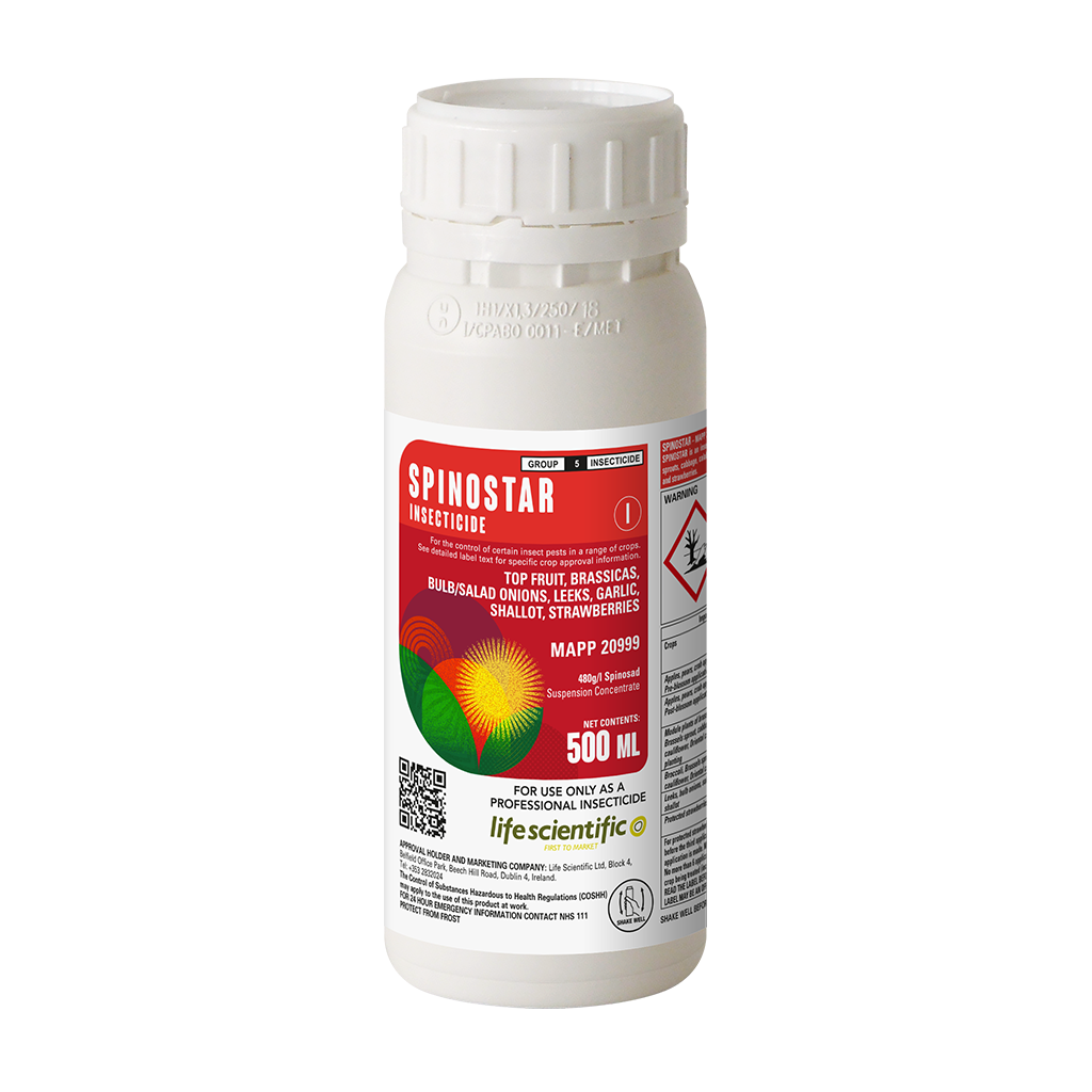 SPINOSTAR is an insecticide for selective use in apples, pears, crab apples, quinces, broccoli, Brussels sprouts, cabbage, calabrese, cauliflower, Oriental cabbage, leeks, bulb onions, salad onions, garlic, shallots and strawberries.