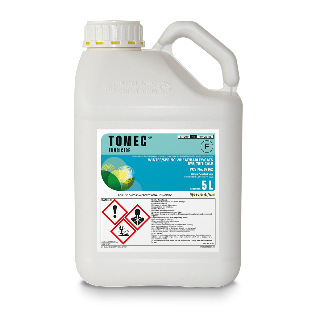 TOMEC is a selective fungicide with a broad spectrum of activity for the control of yellow rust and brown rust in soft wheat and triticale, of yellow rust, dwarf rust, net blotch and Rhynchosporium secalis in barley, of oat crown rust in oats and of yellow rust, brown rust and Rhynchosporium secalis in rye. It contains 200 g/l pyraclostrobin as an emulsifiable concentrate (EC). The product is absorbed by the leaves, acts protectively, curatively and translaminarly and can cause delayed ripening, greener leaves and higher grain yields even without visible disease symptoms.